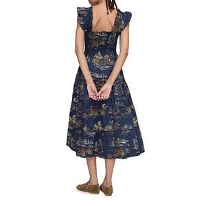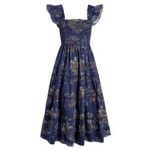 The Ellie is an A-line Nap Dress with our proprietary, elasticated Nap Smocking, ruffled shoulders, tiered midi skirt, and pockets. The Equestrian Toile print is a vintage wallpaper panel sourced from the Design Library and features warm colors on a ground.