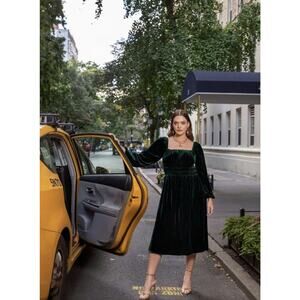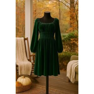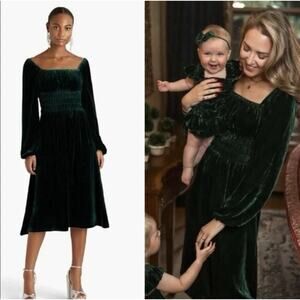 hill house, jasmine nap dress, emerald velvet, cottagecore dress, holiday party outfit, romantic midi dress, square neckline, smocked bodice, hill house home, velvet nap dress, size large, green velvet dress, bridal guest dress, cozy luxury, quiet luxury, holiday hostess, witchy, holiday photo shoot, emerald green, hunter green, Christmas dress, thanksgiving dress
