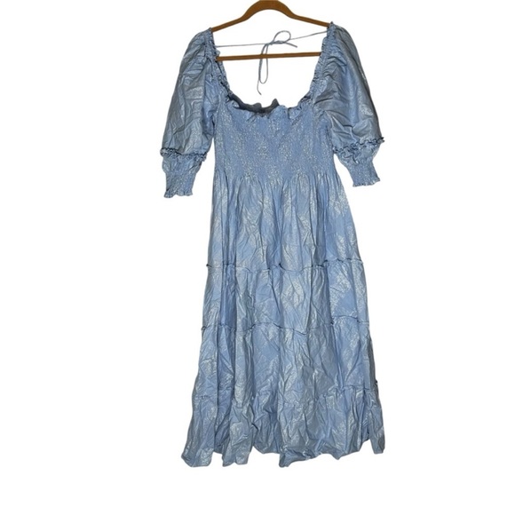 Hill House Nesli Nap Dress Light Blue Metallic Glitter Smocked Square Neck Midi