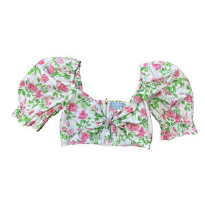 The top has a smocked back which is stretchy. Cropped bralette top. Zips up the back. Puffed sleeves about 9" puff laid flat.