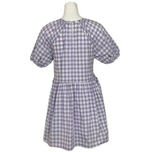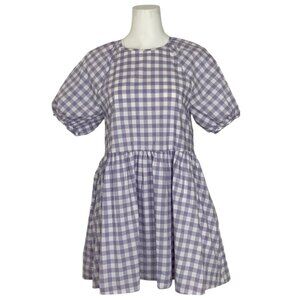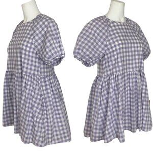 This Hill House women's The Adeline Dress makes a statement due to it's raglan balloon/puff short sleeve, button cuffs, oversized fit, A-line babydoll silhouette, slight high low mini hem, lining, pleats detailing, button keyhole back and purple/white plaid/check design with polka dots.