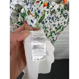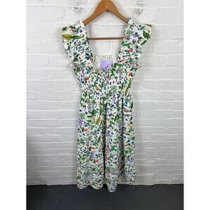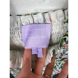 FHill House Stephanie Fishwick Ellie Nap Dress TN or according to brand's websiteCondition: Great pre-owned - no known flawsCollaboration with Virginia-based artist Stephanie Fishwick - limited edition Artist's Edition printSilken Petal Wings is a collage of cherries, oranges, butterflies, and birds in vibrant huesRuffled shoulder accentsPullover stylingSmocked bodicePocketsTiered midi skirtCrepe fabric is woven from GRS-certified 100% recycled post-consumer plastics like water bottles, giving a (stylish!) second life to materials that would otherwise be sent to the landfillIt has a beautiful drape that's dressier than our cotton styles, is washer-friendly and wrinkle-resistant, and thick enough to wear without a slipShell: Recycled polyesterLining: PolyesterMachine washCasual, summer, spring, girly, feminine, partyPlease note that color may vary from photos