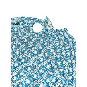 Blue Floral Top Trialing Vine pattern. Ruffle detail at the collar and cuffs - Keyhole back closure. Some photos I am showing show the top paired with the Identical Mirabel Skirt. Listing is for the TOP ONLY.