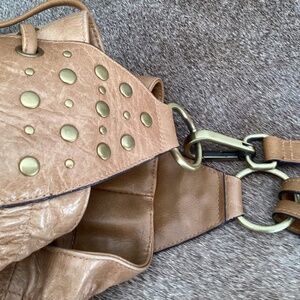 Great leather bucket slouch drawstring handbag with gold tone rivet designs on top strap area. Fully lined inside with zipper pocket and slip pockets both. Great tan colored leather with extra long shoulder/crossbody strap. Gold tone rivets and hardware. This bag has a great look and feel both. Functional and beautiful.