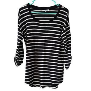 Classic and versatile, this black-and-white striped tunic features a relaxed fit, scoop neckline, and roll-tab three-quarter sleeves with button details. The lightweight cotton-polyester blend makes it perfect for layering or wearing on its own.