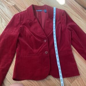 Featuring a beautiful dark red rust color and a peplum-back design, this corduroy blazer offers a flattering and fashionable fit.