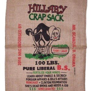 HILLARY CRAP SACK funny BURLAP BAG political satire bag. Approximately 22" x 35". Great quality and very sturdy. Hang it on the wall, stuff it with your things. So many uses for this bag. Brand new. Screen printed design on the front. Made from high quality burlap material.