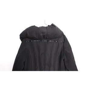 Hillary Radley black down & feather puffer jacket. Filled stand up collar. The jacket features faux leather with beads accents, puffed collar, ribbed underarms and side seams and slash pockets. It is made of polyester softshell fabric. Zip closure. Machine washable No rips, tears, holes or stains. Please note there are belt loops, but no belt.