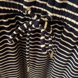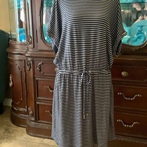Beautiful navy striped midi dress with rolled sleeves, butterfly design that adds inches to bust area, side pockets and cinched tied waist. Waist 19 inches and does stretch, ptp 28 inches, length shoulder to hem 48 inches. Just a darling piece.