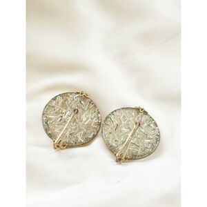 These vintage earrings feature round Lucite cabochons filled with sparkly silver confetti glitter, giving them that classic mid-century flair. Wrapped in gold-filled wire, they showcase the signature ear wire “slide” findings that Hillcraft is known for—designed to slide onto the earlobe at an angle for a comfortable, secure fit without clips or screws. Measuring about 1" in diameter, they’re a lovely statement size. Please note: one earring has some light scratches causing a bit of cloudiness, but it’s subtle and not distracting when worn. Overall, they’re in very good vintage condition with tons of sparkle and charm.