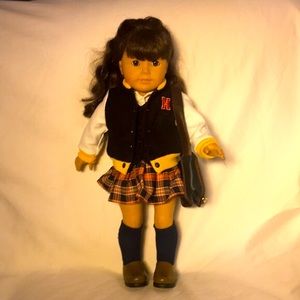 Hillside Academy School Uniform for 18” dolls includes shirt, vest, plaid skirt, headband, navy knee socks, loafers, jacket & messenger bag (opens).