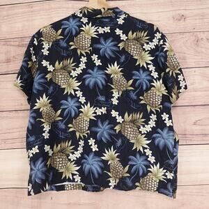 Hilo Hattie Aloha Shirt Womens Large Navy Pineapple Print Rayon Made in Hawaii