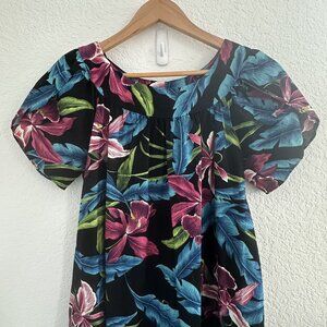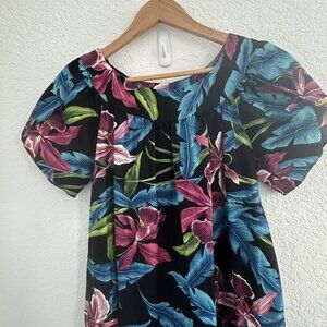Features: Vibrant hibiscus flower and blue leaf all-over print, short sleeves, gathered scoop neckline, pullover style, knee length
