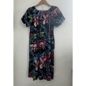 Hilo Hattie Dress Womens Medium Black Floral Orchid Print Hawaiian Made In Hawaii