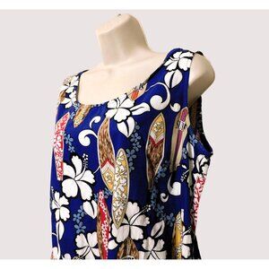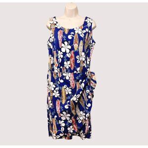 Hilo Hattie Hawaiian Dress L Blue Surfboard Floral Print Sleeveless Wrap Cotton