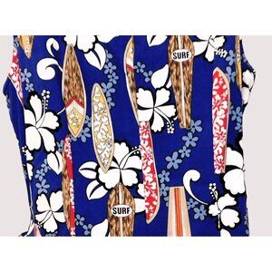 Bright, colorful Hawaiian wrap dress by Hilo Hattie. Features a surfboard floral print on a blue background. Perfect for the beach or a casual day out.