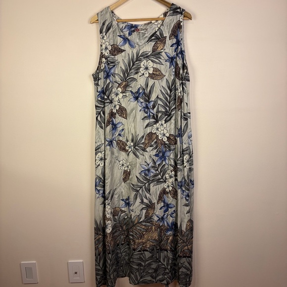 Vintage floral maxi dress by Hilo Hattie. Features blue and gray muted floral design. Sleeveless and flowy.