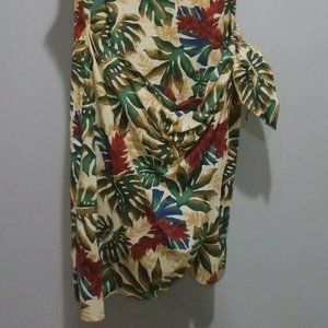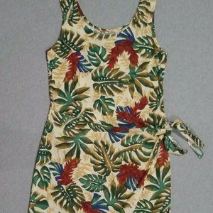 Details: Mini, Pullover, Wrap Tie Front, Sleeveless, Scoop Neck, Floral, Hawaiian, Tropical