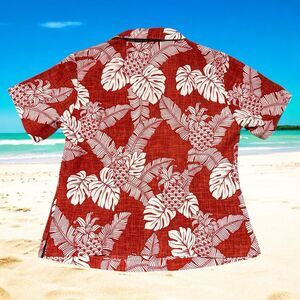 Hilo Hattie Hawaiian Shirt Women’s Medium Red White Palm Print Aloha Button Up.
