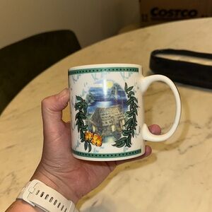 Enjoy your favorite beverage in this charming mug featuring a scenic cottage design. The green accents add a touch of nature to your dining experience.