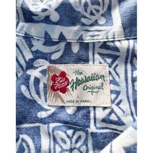 Vintage Hilo Hattie men's casual button up Hawaiian shirt. Shirt is done in the reverse print style that Hilo Hattie is known for. It's blue and white done in a tropical fish, stylized turtle and floral print. And best of all, it has the classic coconut buttons down the front. Shirt is made of 100% cotton and is a man's size large. Made in Hawaii.