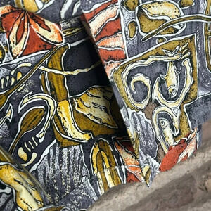 Men’s vintage Hawaiian shirt with squares of different tribal and local details, flowers and volcanos