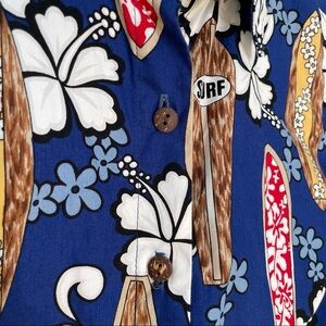 Excellent, like new condition! Blue with white floral pattern and colorful floral pattern surfboards. Sleeveless button down shirt.