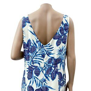 This sleeveless maxi dress by Hilo Hattie offers a distinctive Hawaiian print in blue and white. Made from 100% rayon, it provides a comfortable and breathable fit, perfect for warm climates. With a flattering V-neck front and back, it combines elegance with a laid-back island style.