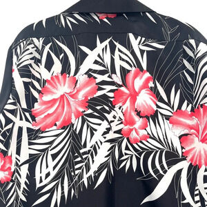 Black with white palm leaves and pink / red hibiscus floral print. Short sleeves, collared, buttons down front. Synthetic.