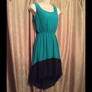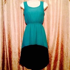 Kelly green and black hi-lo dress, size Medium. Worn twice, EUC!! Fits size 2---size 6, gathered at the waist, curved neckline, waist and hemline, v back with tie at the neckline.
