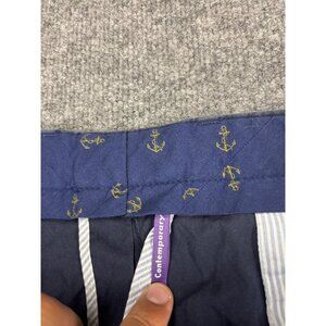 Notable details: Anchor print on inner waistband, striped pocket lining, flat front with button closure