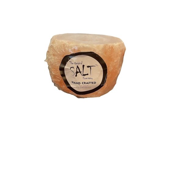 NEW The Original Salt Company Handcrafted Candle Holder. This natural carved candle holder adds an organic touch and calming soft warm glow to any environment. Purifies air quality by emitting negative ions that fight against positively charged particles. Reduces allergens and impurities such as: odors, mold spores, pollen, pet dander, cigarette smoke, viruses, bacteria, dust and other harmful airborne particles that can cause allergies & illnesses. Measures appx 3.5” x 3.5” diameter. Weighs 2lb 5oz.