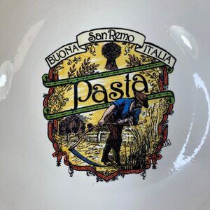 Ever wanted a bowl that screams "pasta" louder than your Italian grandma? This bowl is so Italian, it might start speaking with an accent. Pasta serving bowl made in Italy for Himark. Large smooth glossy bowl has a red, green and black band around the rim and has a scene in the center of a farmer harvesting wheat with the words "San Remo Buona Italia". Bowl is ribbed all around the outside. Stamped on bottom. Perfect for large family dinners.