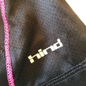 Hind workout yoga dance pant leggings in black with pink accents. These are around knee / below knee length. These have an adjustable waist tie and zip pocket. Size Large.