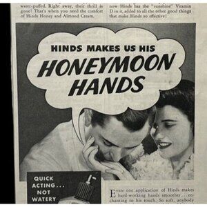 This vintage advertisement promotes Hinds Honeymoon Hands Cream, known for soothing and smoothing red, chapped hands.
