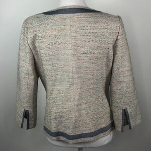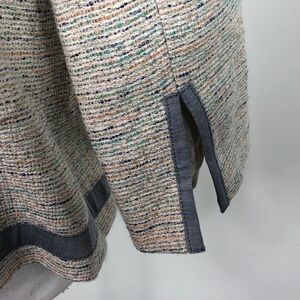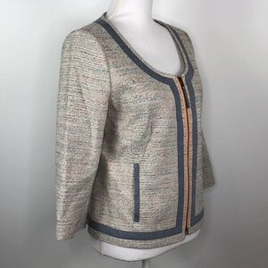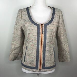 Hinge from Nordstrom zip front tweed blazer with orange and cadet blue accents. 3/4 length sleeves. Gently used condition. Size medium. Measurements are approximate and taken when laid flat. Shoulders: Sleeves: Armpit to Armpit: 19" Length: 22".