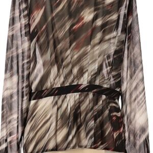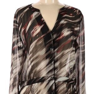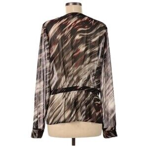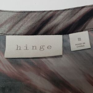 Hinge Long Sleeve Blouse Size M Pleated Peplum Button Front. Black, brown, cream neutral abstract print. Excellent pre-owned condition with no noted flaws.