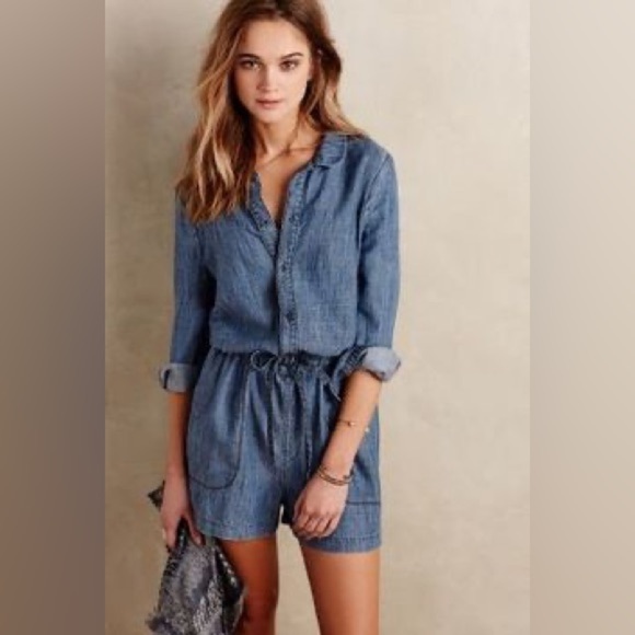 Stylish denim romper with long sleeves and button-up front. Features a drawstring waist for a comfortable fit.