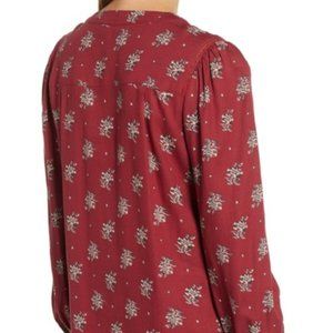 A simple V-neck blouse gets styled up with lace stripes framing the front and slightly puffed shoulders topping the sleeves.