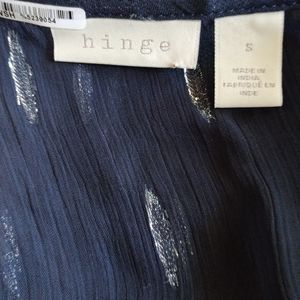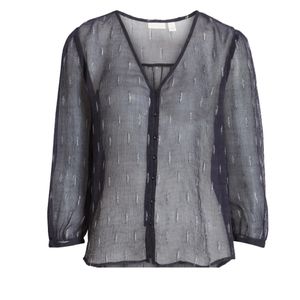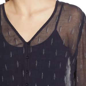 Hinge Sheer Metallic Top features a V neckline, button front closure, and straight hemline