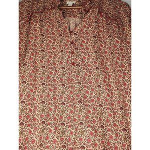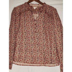 This navy and rust floral print blouse is a feminine long-sleeved piece. With a ruffled collar and yoke, it's flowy and perfect for any occasion. Size Medium.