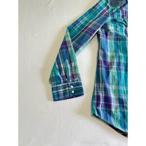 Hinge Plaid Button Down Mini Dress Top Flannel Blue Purple Green Size Medium