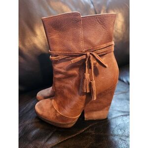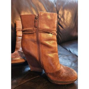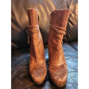 This is a pair of hinge, exclusive designs made in Seattle leather/suede boots. Beautiful brown leather with a suede toe on the front to add more stylish, Color brown/whiskey Inside zipper closure A decorative fringe tassel suede wrapped around the boots Plataforma wedge heigh 4 1/2