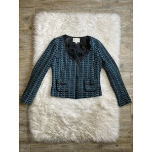 Hinge Seattle Size Medium Blue Green Black Tweed Jacket Faux Leather Trim. Condition is Pre-owned. Shipped with USPS Priority Mail.