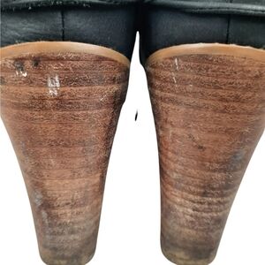 This is a pre-owned item that may show signs of wear. There are some scuffs on the wooden stacked heels and there is a tiny piece of wood missing, it is not noticeable.