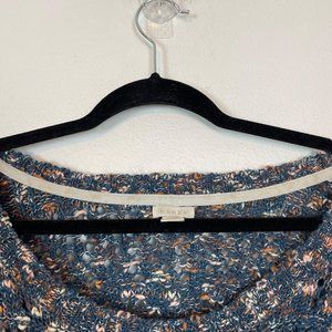 This is a blue wide neck open knit long sleeve chunky textured sweater from Hinge. This piece features brown and orange detailing throughout. A great fall back to school piece.