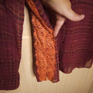 Hinge women’s orange purple sheer plaid blouse medium. Gently used condition. Measurements are: 25” sleeve, 26” from shoulder to hem, and 20” from armpit to armpit.