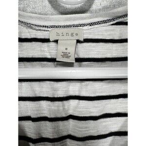 This Hinge Women's Small Top is a stylish T-Shirt made of lightweight cotton fabric that is perfect for casual occasions. It features a scoop neckline and lace sleeves that add a touch of elegance to the striped navy and white design. The top is easy to wear with its pullover closure and fits regular sizes. It is machine washable and suitable for all seasons including summer, fall, and spring.