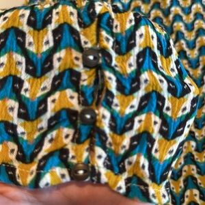 Vibrantly colored Hinge hi/lo blouse, made in India. Crinkled material allows for a lot of stretch. Neck can be worn open or closed (see photos). Longsleeve. Size XL. Fox face design, 100% rayon. Tiny buttons to close neck, and at wrists.
