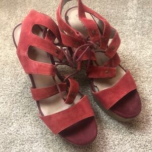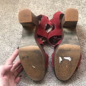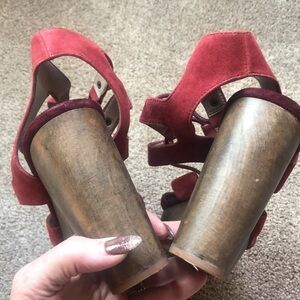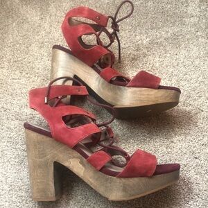 Hinge red suede leather lace up wood block heel strappy shoe 8